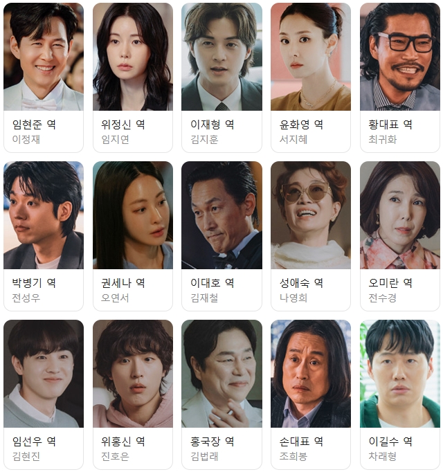 | 이정재 | 임현준 | 40대, 정의로운 형사 이미지에 갇힌 국민 톱스타. 멜로 장인을 꿈꾸지만 대중의 시선과 한계 속에서 갈등 |