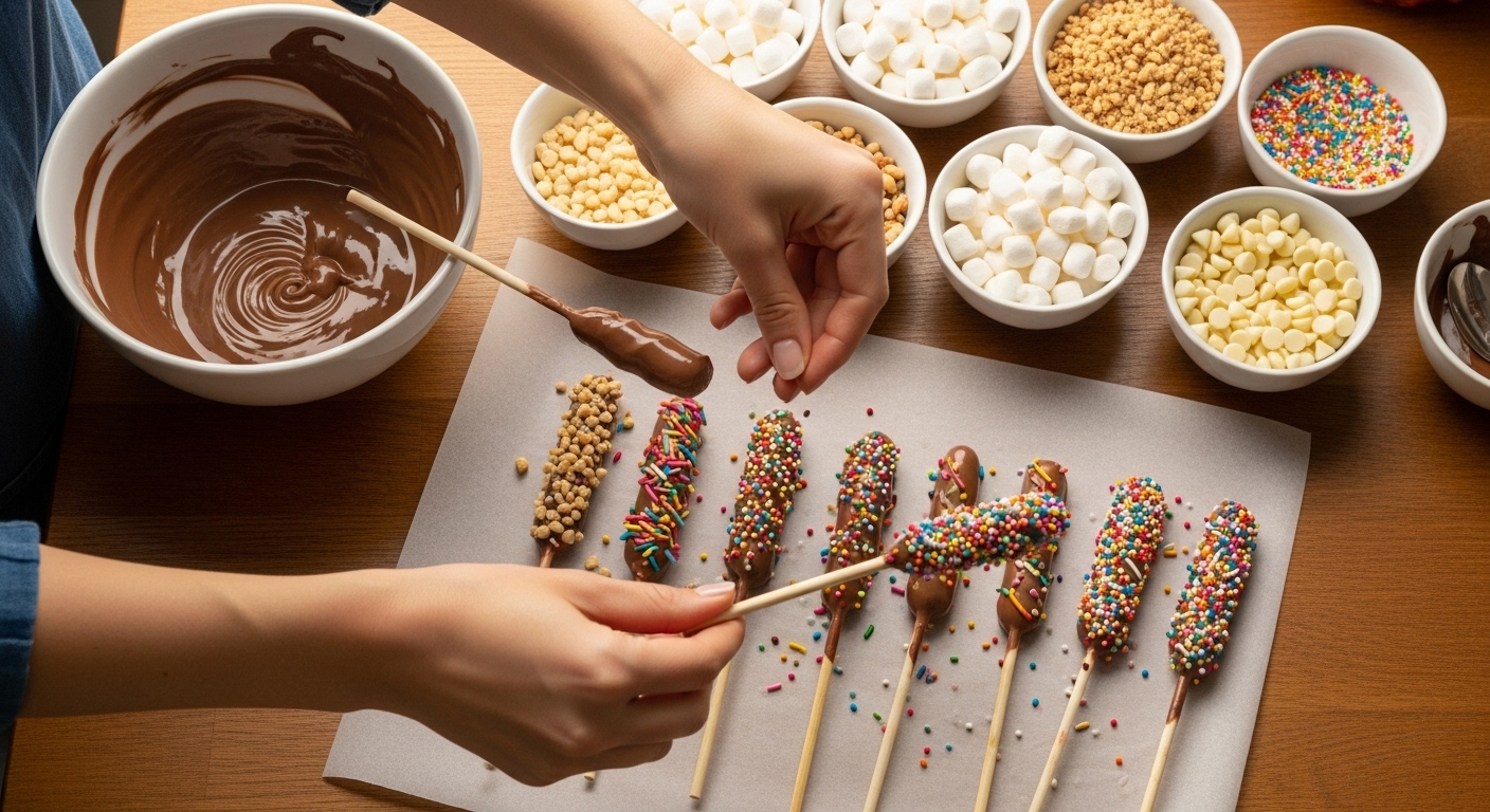 - 초콜릿을 중탕으로 녹이고, 막대과자를 초콜릿에 담가 코팅합니다.