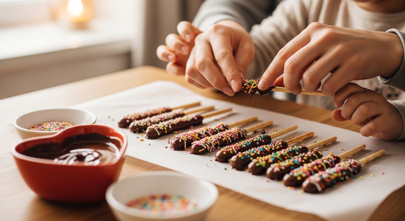 - 초콜릿을 중탕으로 녹이고, 막대과자를 초콜릿에 담가 코팅합니다.