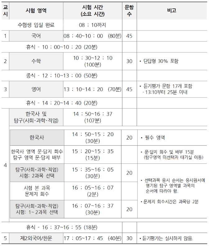 | 1교시 | 국어 | 08:40~10:00 (80분) | 45 | 응시선택 가능, 미선택자도 08:10까지 입실 |