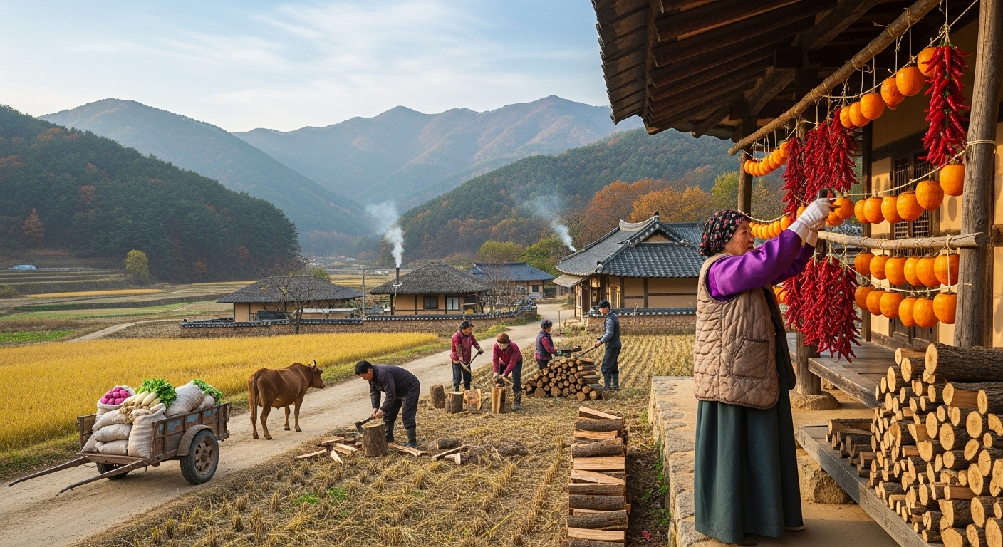 김장하는 시기, 장작 쌓기, 난방시설 점검, 의료·영양식 챙기기 등 월동을 체계적으로 준비합니다.