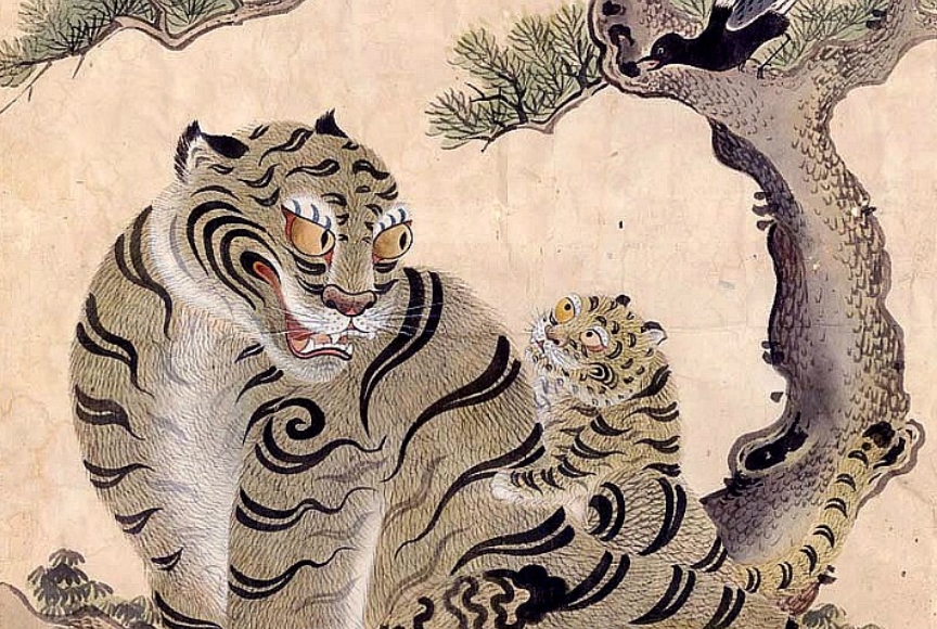 산신이자 액막이. 웃는 호랑이는 온화한 보호자, 새끼 호랑이는 자손 번영 기원.