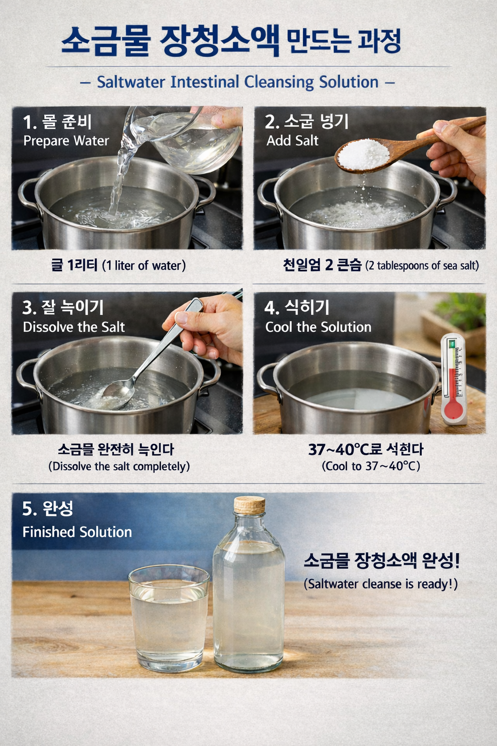 소금물 장청소의 핵심은 우리 몸의 체액 농도(0.9%)를 정확히 맞추는 것입니다. 맹물을 대량으로 마시면 소변으로 배출되지만, 0.9% 농도의 소금물은 장을 그대로 통과하며 노폐물을 쓸어내립니다.