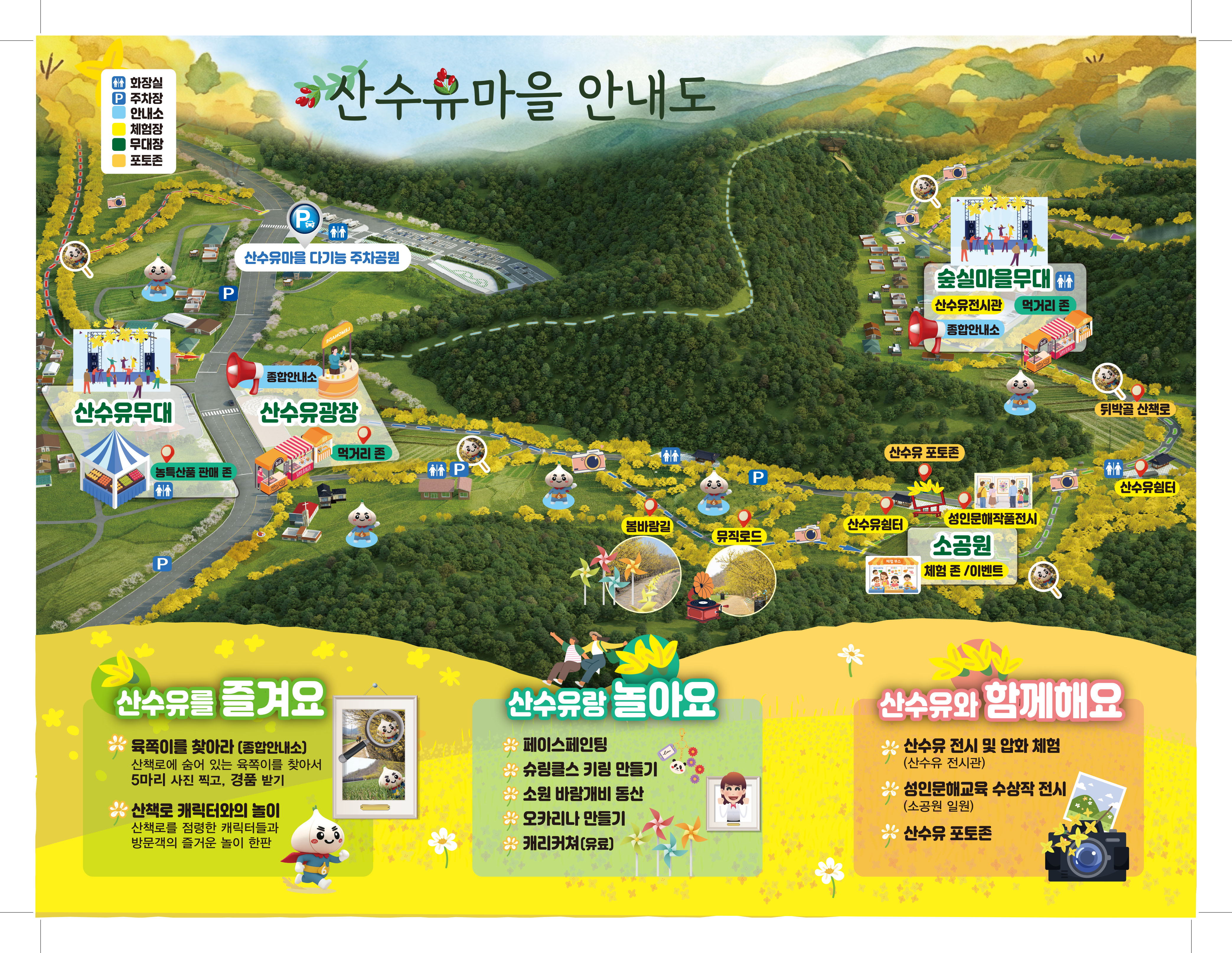 · 산수유 압화·공예, 바람개비·오카리나 만들기, 농특산물 시식 등 가족 단위 체험 부스 운영.[web:244][web:247]