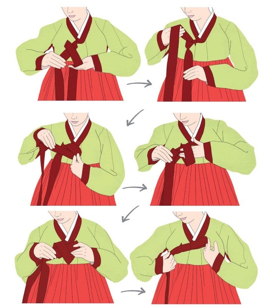 >허리에 띠를 둘러 양쪽 끝이 앞에서 만나게 합니다.