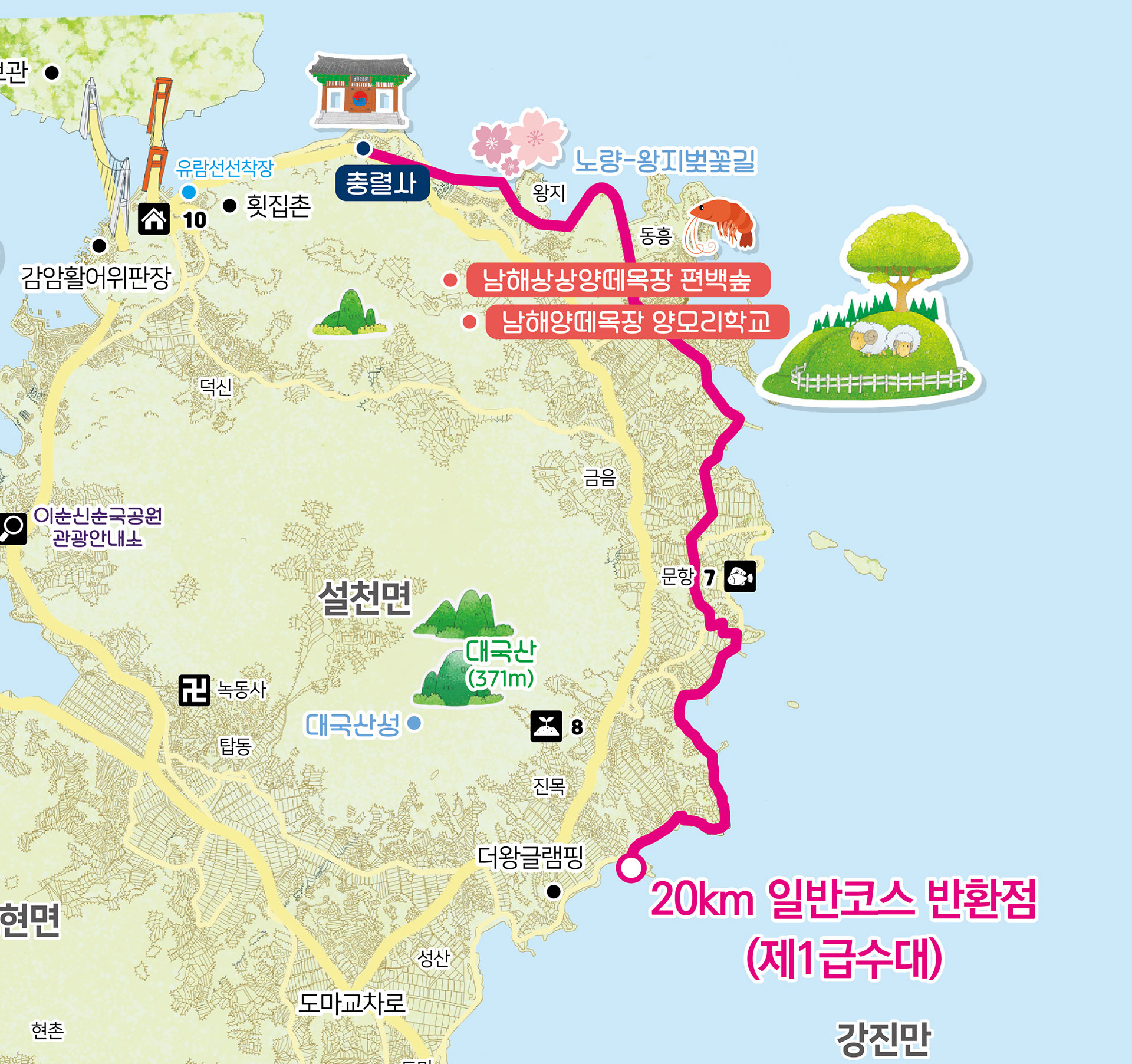 | 일반(가족) 코스 | 약 20km | 남해충렬사 ↔ 진목해안쉼터(게섬다리 인근) | 초보·가족, 사진 찍으며 여유 라이딩 (짧은 언덕 포함) |