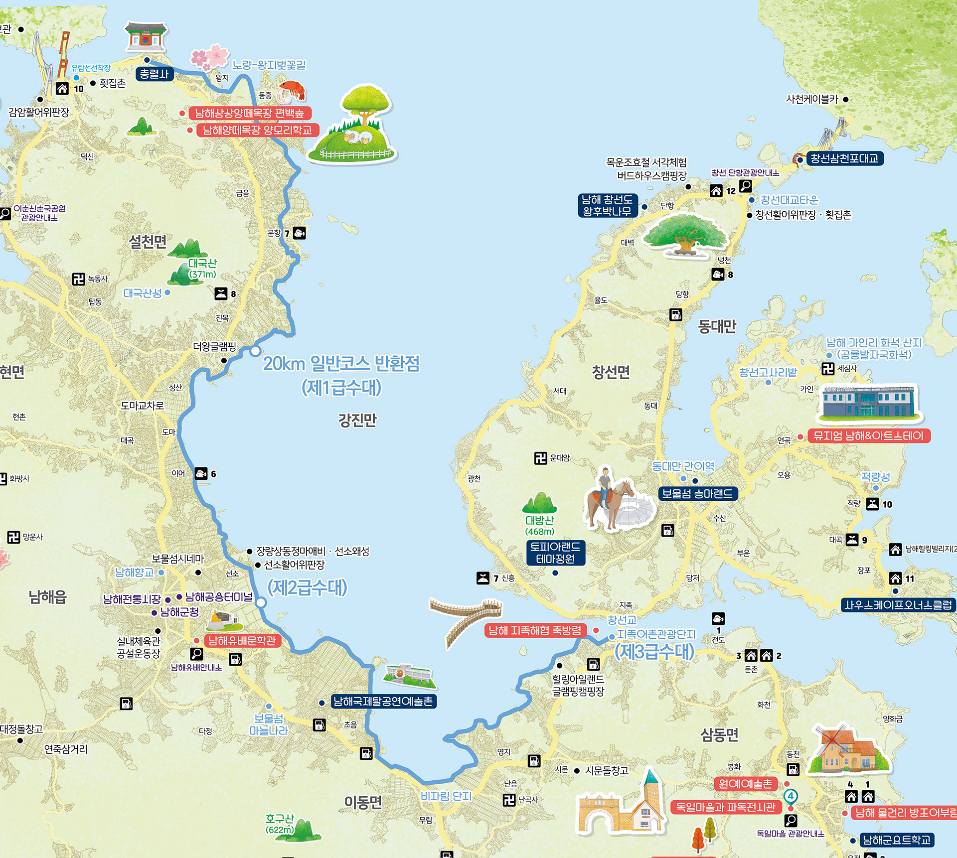 | 전문(동호인) 코스 | 약 70km | 남해충렬사 ↔ 모천갯벌체험장 ↔ 게섬다리 ↔ 선소마을 ↔ 비자림 ↔ 지족 죽방렴 홍보관 일대 | 장거리 경험자, 업힐·다운힐 좋아하는 라이더에게 적합. 평지 비율이 낮은 편 |