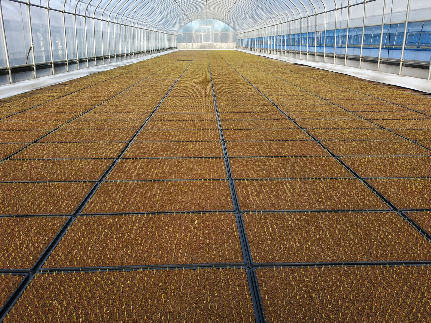 하우스 못자리에서 고르게 출아한 벼 모판 — 온도 관리가 첫 번째 관문입니다