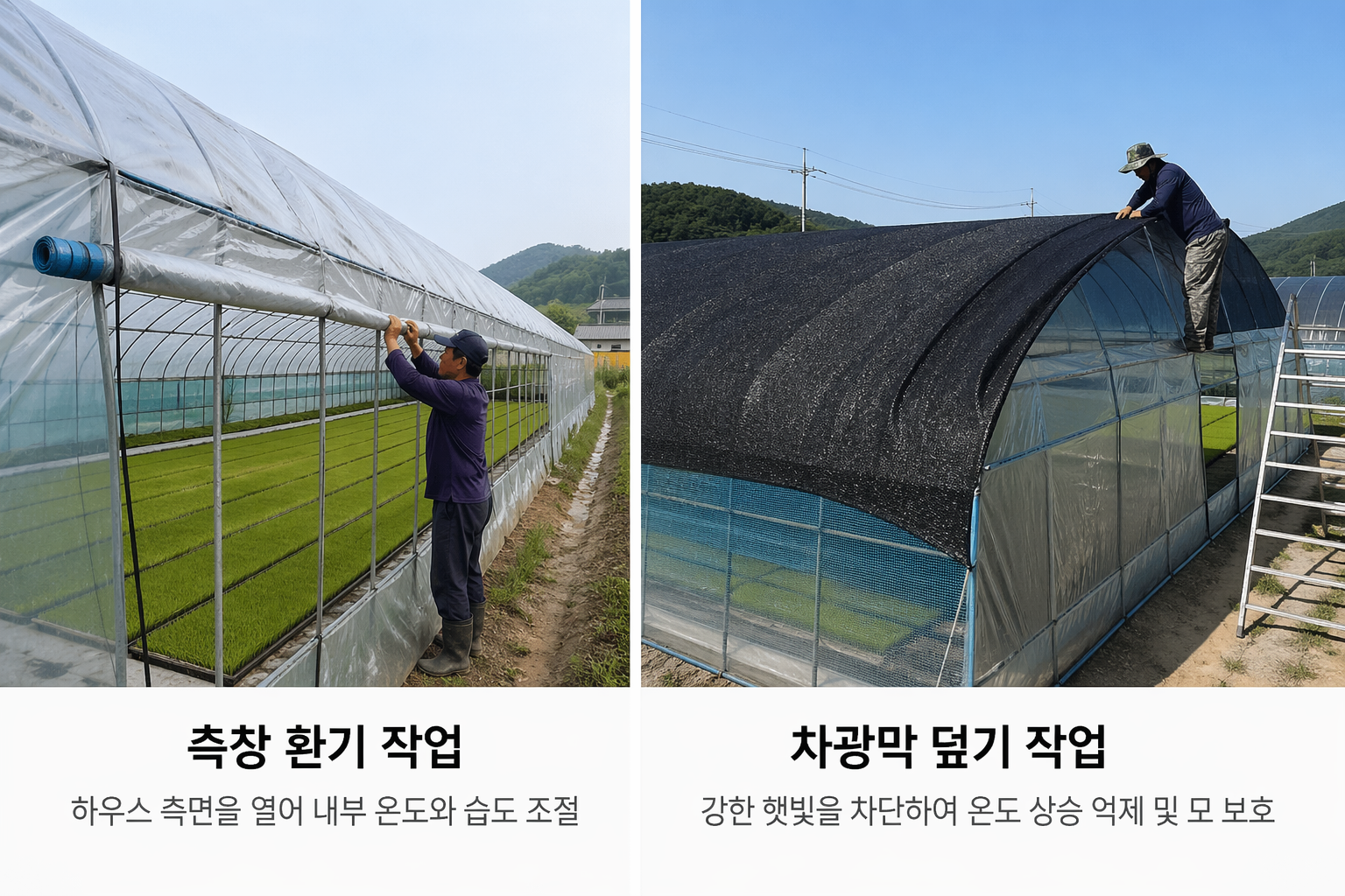 낮에 측창을 열어 환기하는 하우스 못자리 — 온도 관리가 뜸묘 예방의 핵심입니다