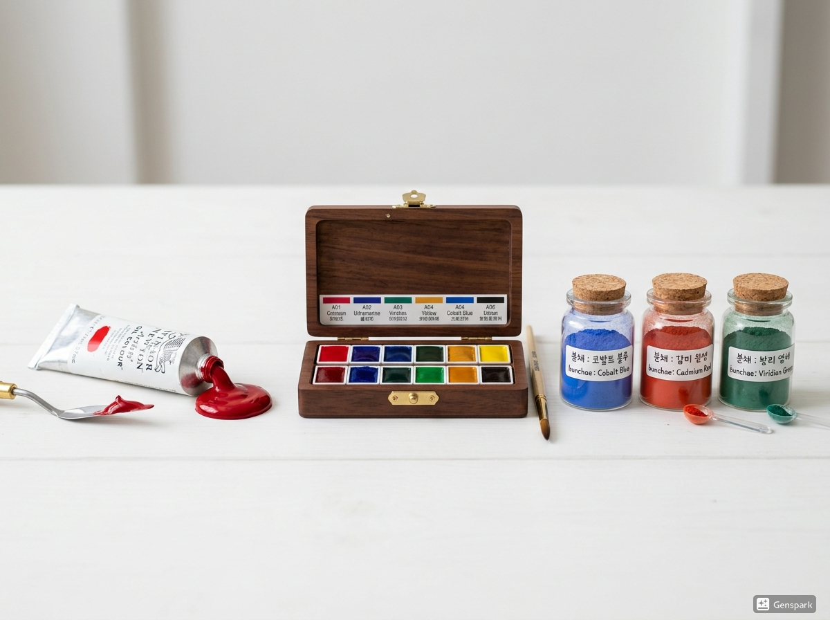 사용 팁: 초보는 튜브물감으로 시작해, 점차 분채를 섞어 쓰며 깊이감을 더해가는 것을 추천합니다.