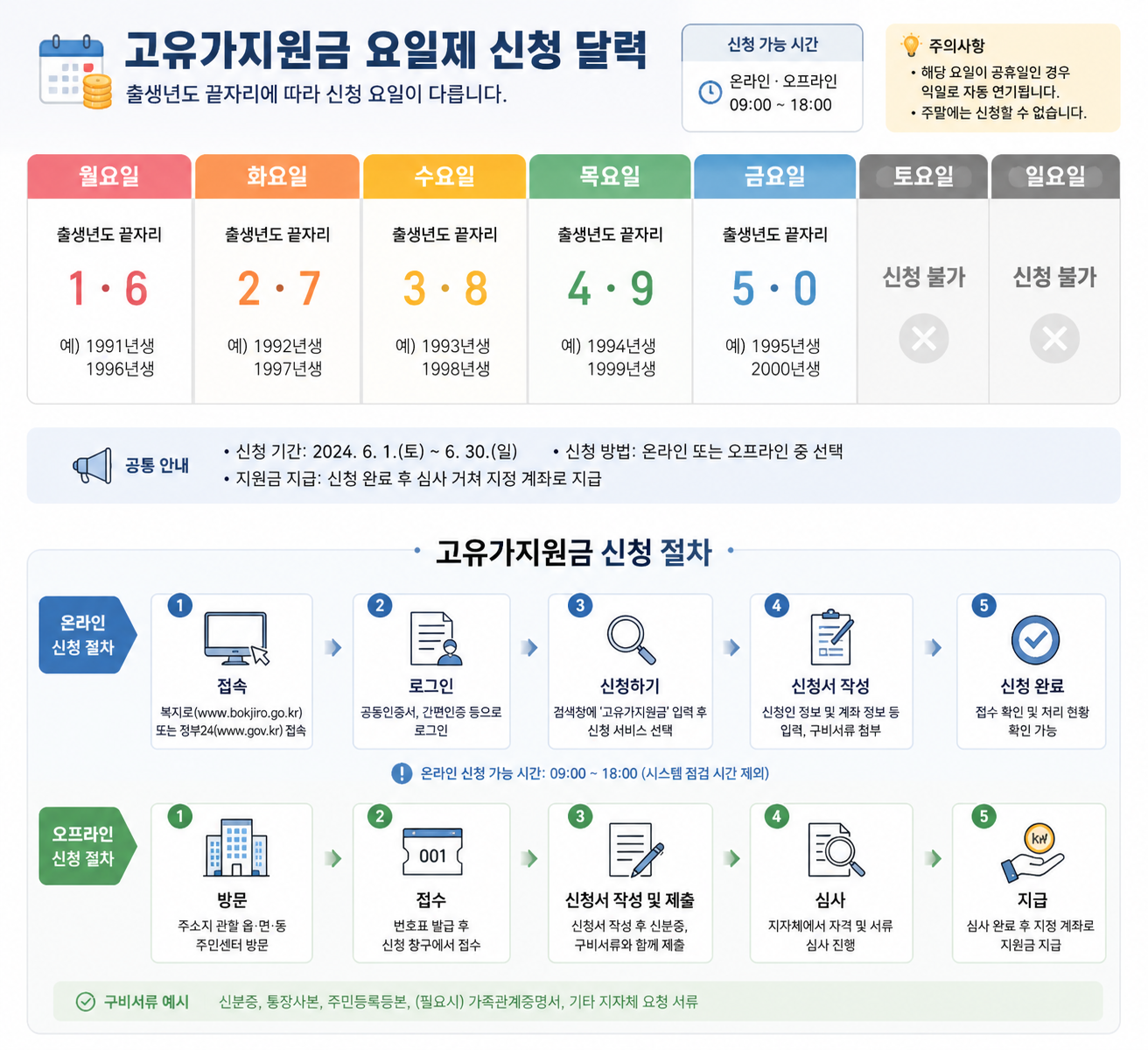 지원금 신청은 혼잡을 막기 위해 대상별로 1차와 2차로 나뉘어 진행되며, 첫 주에는 출생연도 끝자리 요일제가 적용됩니다.