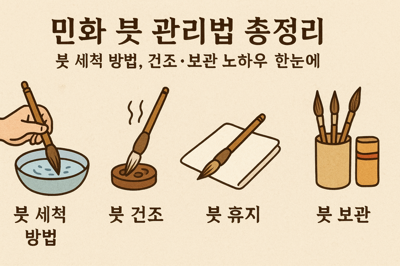 - 민화 붓 관리는 ‘즉시 세척→붓털 정리→자연 건조→적절 보관’이 핵심 공식입니다.