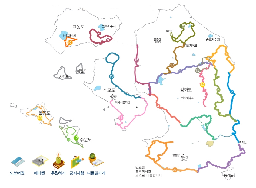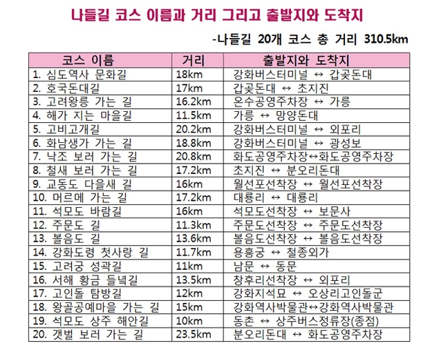 17km 나들길은 4~6시간, 산 코스(마니산, 고려산)는 2~2.5시간, 혈구산 등은 1~1.5시간 내외입니다.