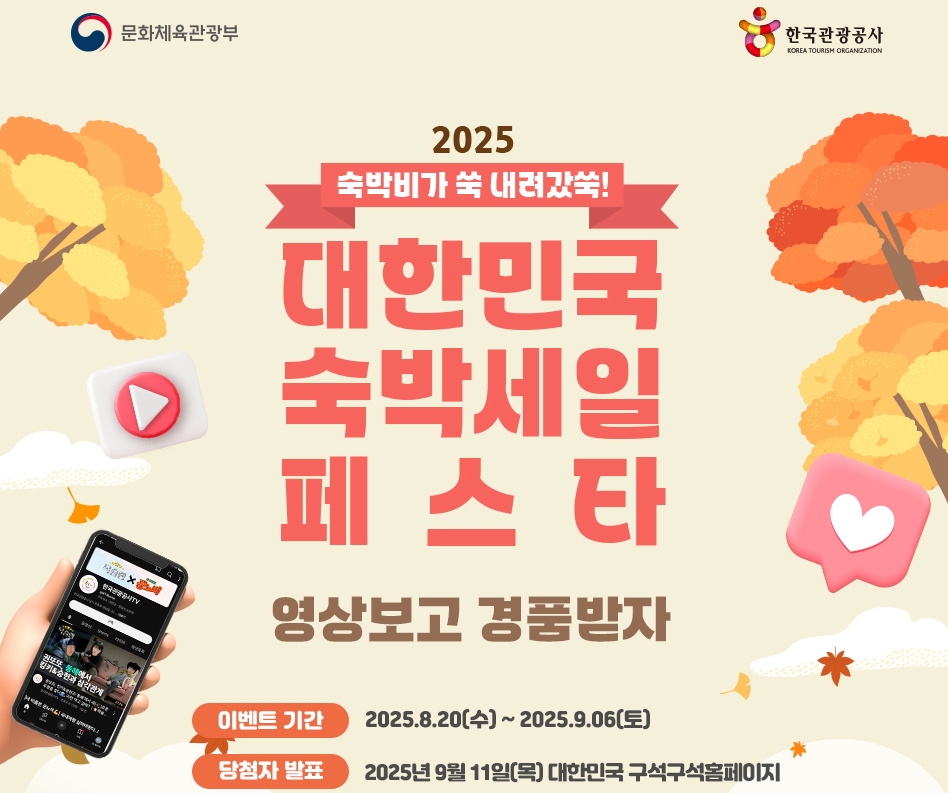 | 한국관광공사 가을 숙박大세일 | 9월 1일 ~ 9월 30일 | 롯데호텔, 신라스테이, 그랜드 하얏트 등 | 최대 50% 할인, 조식 포함 특가 |