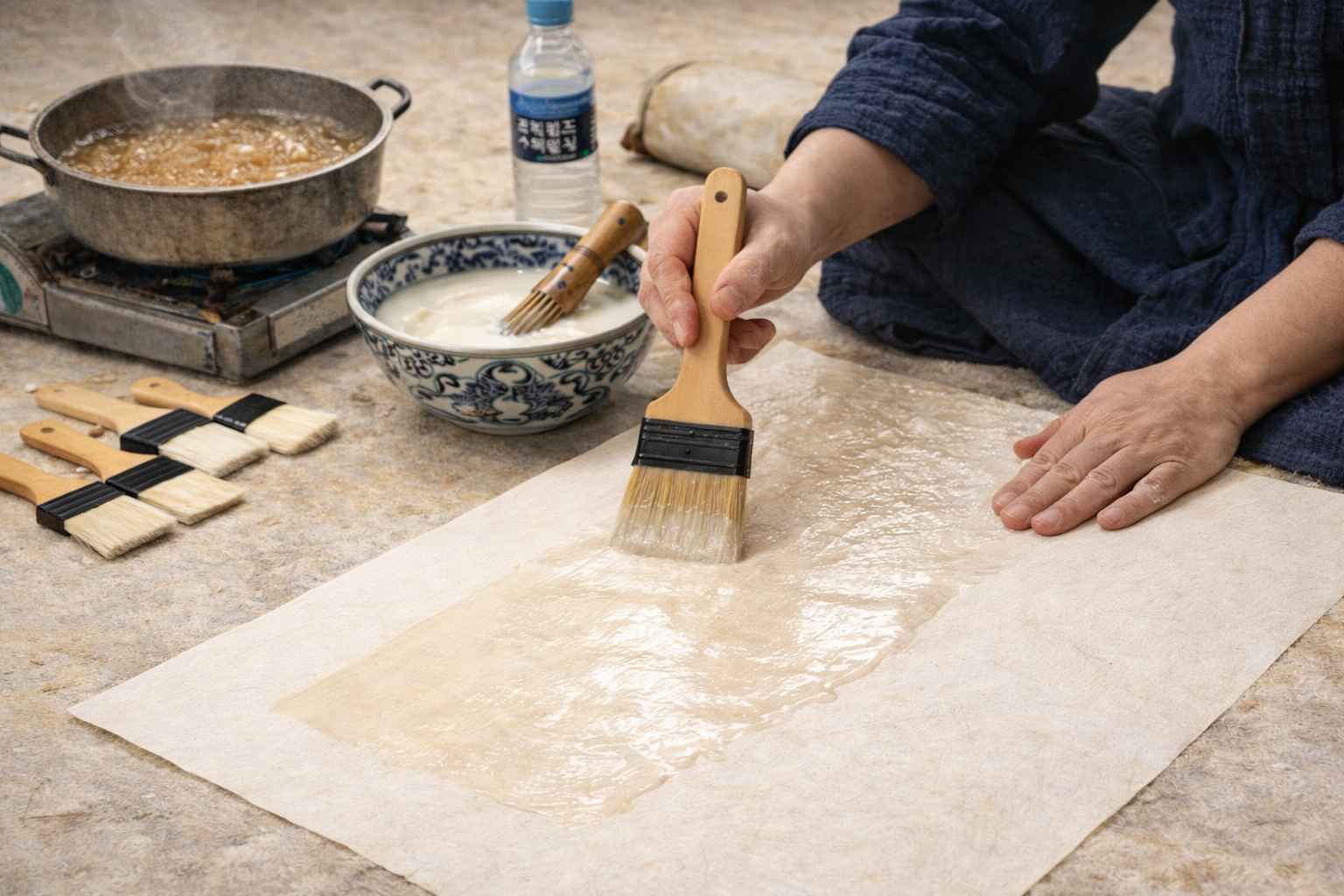 “아교와 물 비율, 반드시 온도·재료 차이 반영!” 천연 아교/분말, 수입/국산, 심지어 수돗물 미네랄 조성도 건조·기포에 영향! 바탕종이·기온·습도에 따라 소량 먼저 테스트해보는 게 정석입니다!