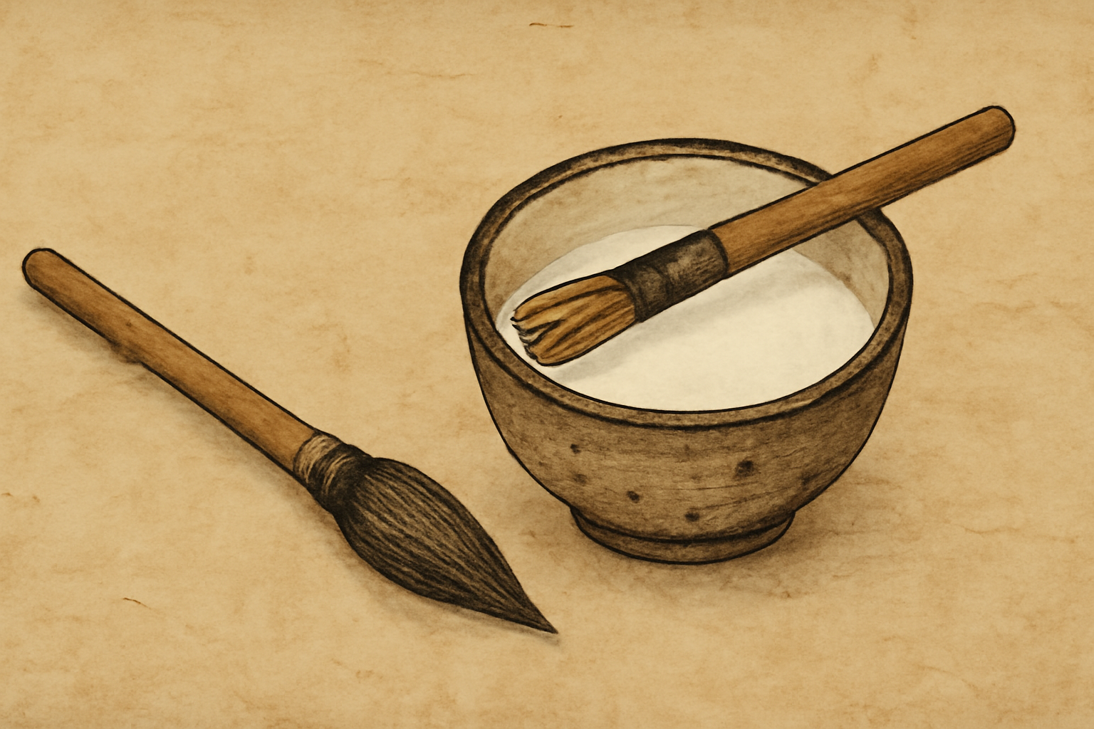 | 분말 아교(화방/문방구용) | 사용·계량 용이, 저렴, 가루/페이스트형. 접착력은 천연 > 분말 | 물에 30분 이상 불려야 기포X, 응고 천천히&붓질 연습 필요 |