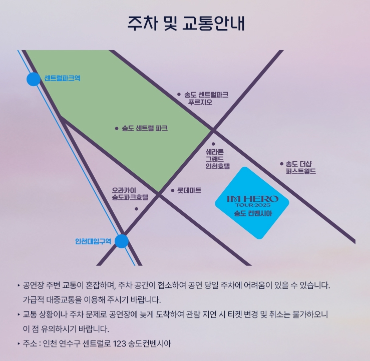 - 공연장 출입구 혼잡 최소화 위해 조기 도착 및 대중교통 이용 권장