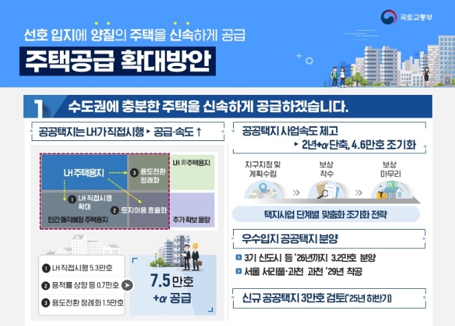 - 공공택지 공급 확대: 수도권 및 지방 광역시 중심 공공택지 공급 확대 목표 증대, 지구지정 조속 추진