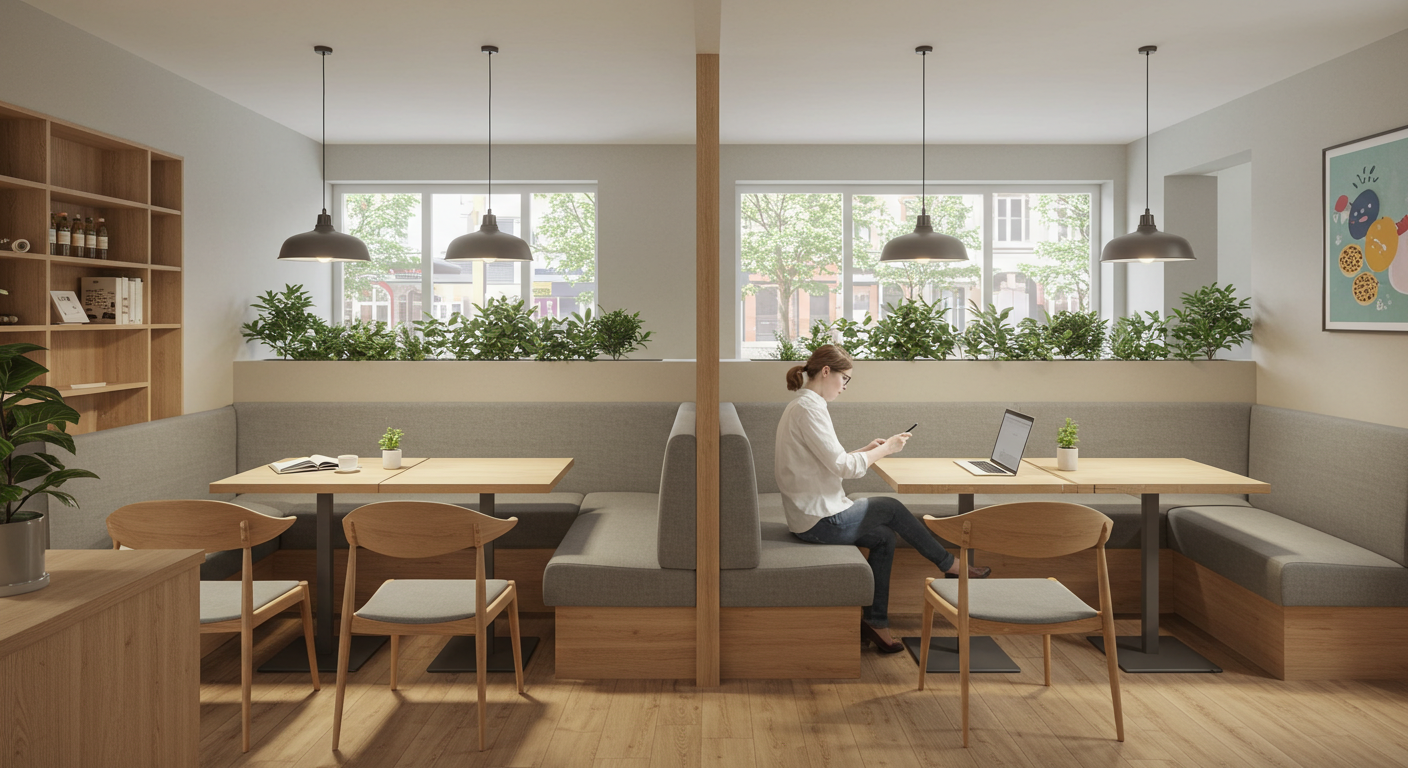 - 벽면 좌석: 집중력 강화와 프라이버시 보호 효과