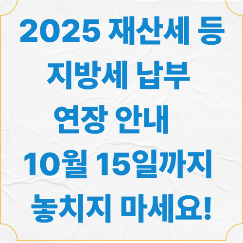 - 2025년 재산세 2차분 납부기한이 10월 15일로 연장되었으니, 연체료 발생 전 꼭 납부하세요.