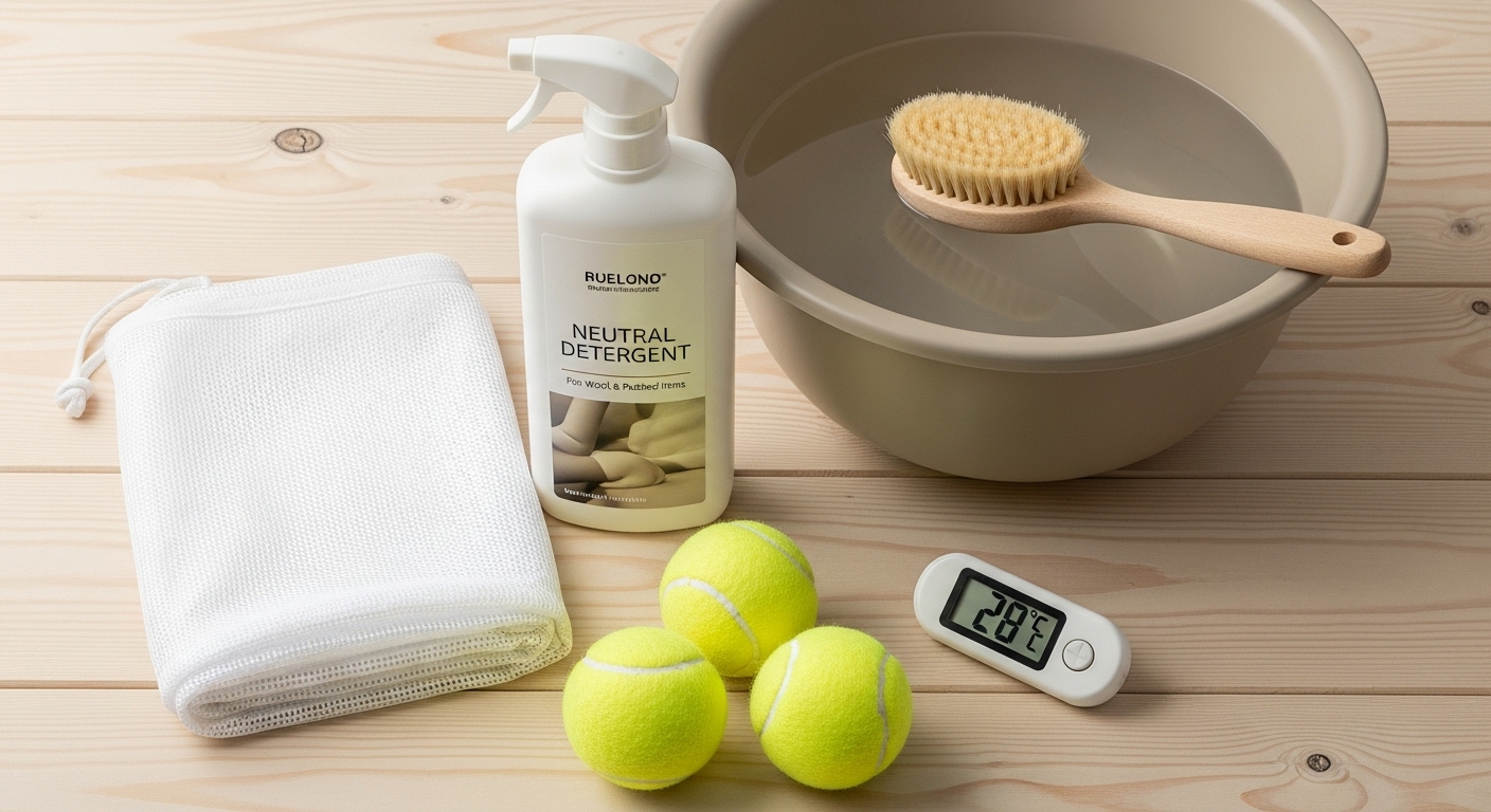 - ❌ 뜨거운 물 사용: 충전재 손상, 원단 수축